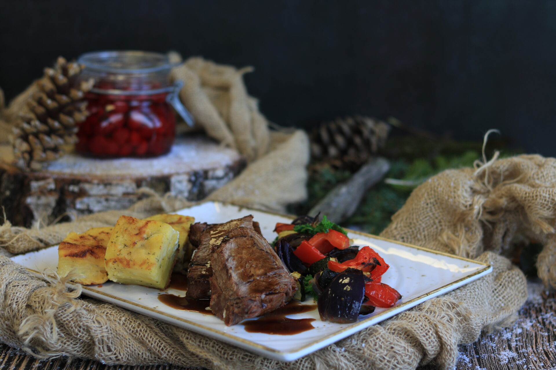 Pitkään haudutettua naudan niskaa ja punaviini-kastanjakastiketta (G, L)